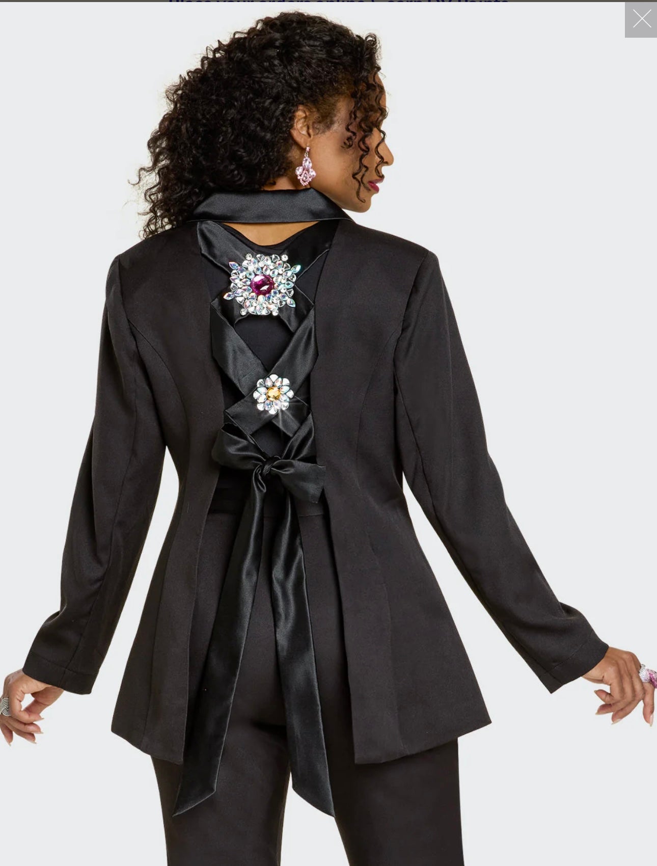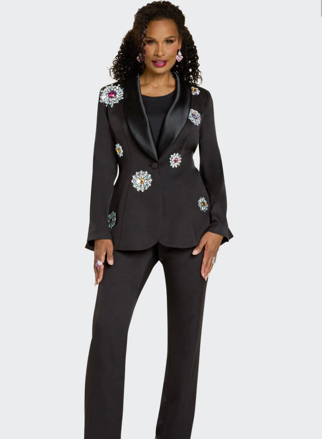 This pant set has a fabulous jacket with a corset style back, set off with blinged out floral detail.  Cami shell and matching straight leg pant